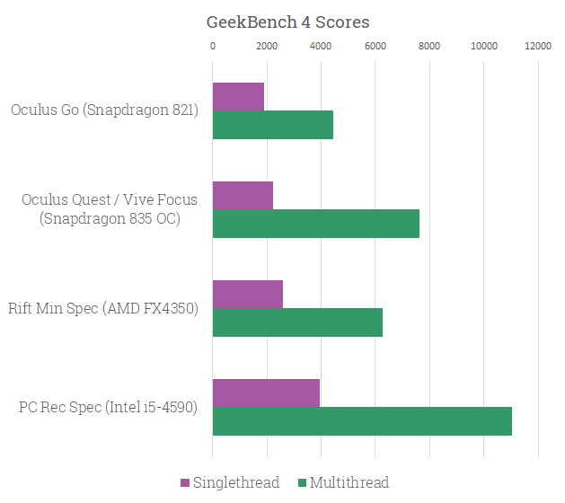 As can be seen, the 6DoF standalone headsets’ CPUs actually come close to PC minimum spec, falling behind in singlethreaded performance but actually pushing ahead in multithread.