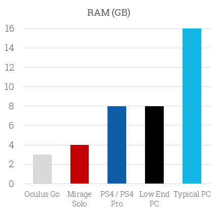 It’s important to note that on a PC or PS4, the operating system itself uses much more RAM than Android (the OS underlying standalones). Android was designed for very low RAM devices and the onboard storage is much faster than a typical hard drive, so almost all of the RAM will be available to the VR app.