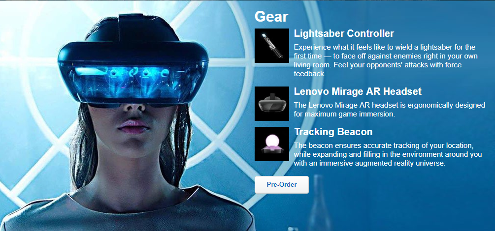 At the D23 Expo in Anaheim, CA earlier this year Lenovo and Disney revealed a partnership, with Lucasfilm, to work on a Star Wars-themed AR experience platform. Titled Star Wars: Jedi Challenges, users would don a specially created Lenovo headset, hold a replica lightsaber handle, and embark on a series of adventures and challenges to become one with The Force.