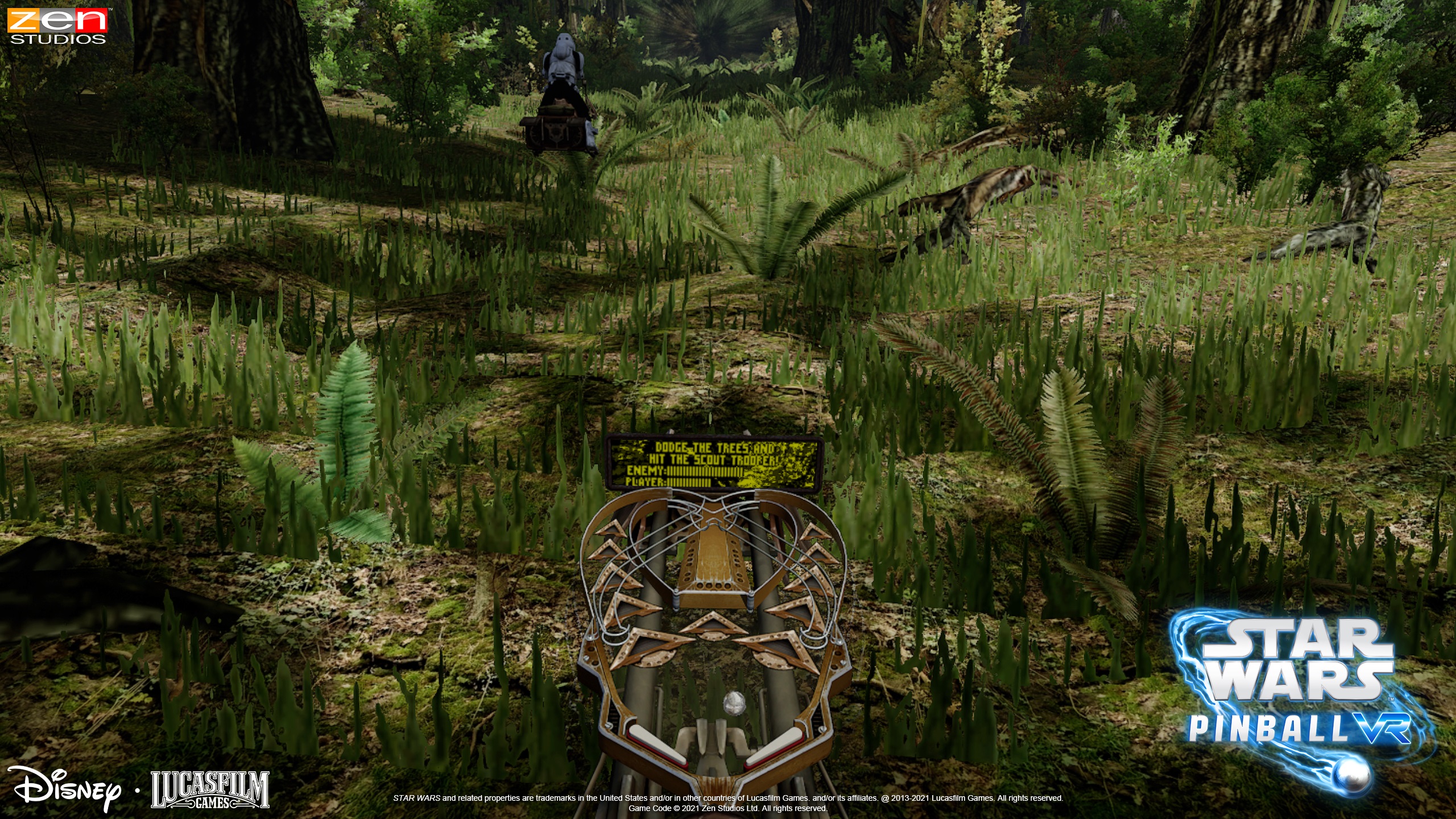 If you’ve played the non-VR version of Star Wars Pinball then you’ll be able to enjoy several new features in the VR version. For example, there’s a new home environment called the Fan Cave with a customizable array of lightsabers, blasters, helmets, and more to tinker with between pinball tables. Action figures become life-sized characters in the room with you and vehicles blow up to realistic size right at your feet. Not to mention the immersive 360-degree mini games that take place, such as the speeder bike chase scene on Endor, shown in the screenshot below.