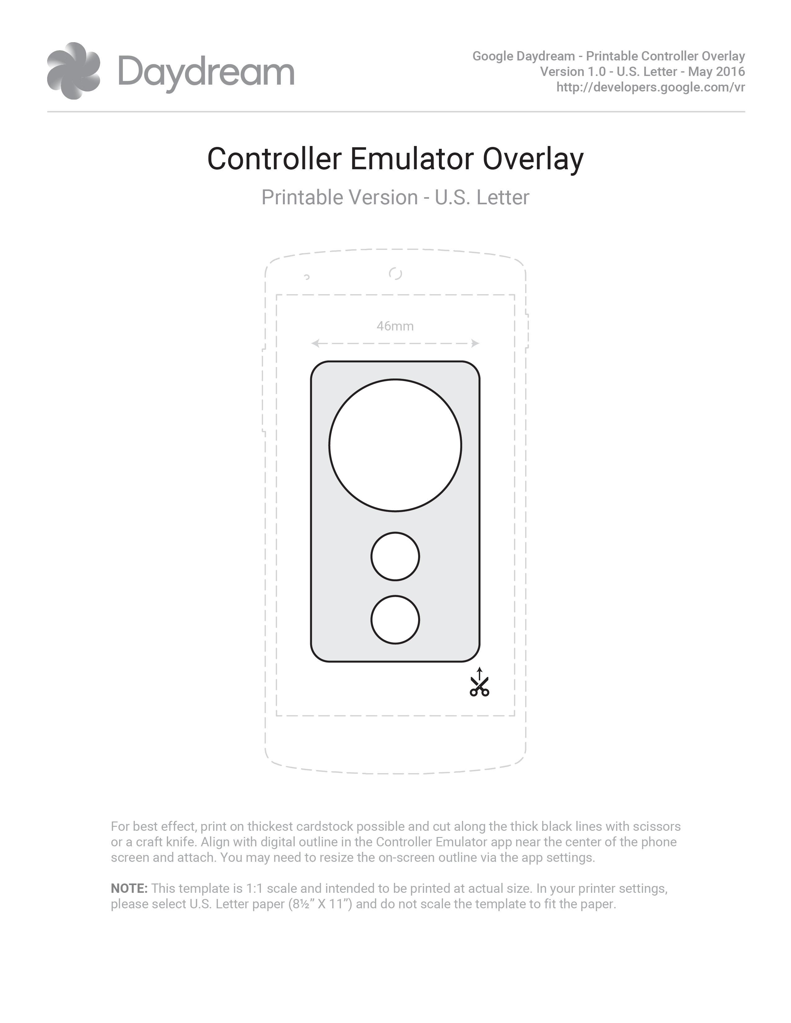 Several prominent VR developers are already on board with Daydream, such as EA and Ubisoft, as well as CCP with an exclusive EVE: Gunjack sequel. You can find additional infomation about developing for Daydream on Google’s official Developer Blog. You can also download printable Daydream phone controller emulator overlays via the images below.