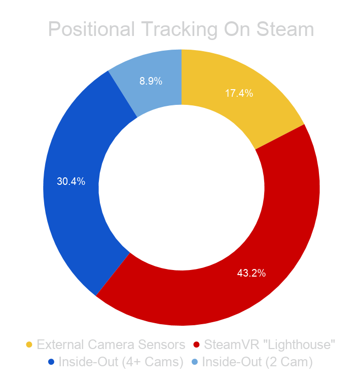 Inside-out tracking has enabled lower-cost headsets and easier setup, accounting for the majority of VR headset growth since May 2019 thanks to the Rift S. However, 6 in 10 headsets on Steam are still tracked with external hardware thanks to the huge numbers of Oculus Rift and HTC Vives still in use.