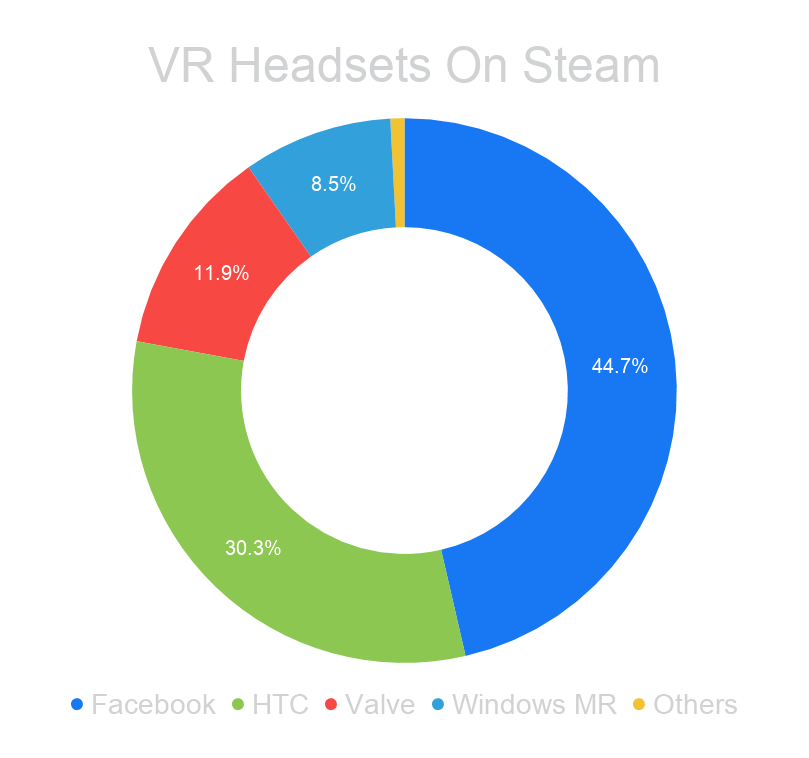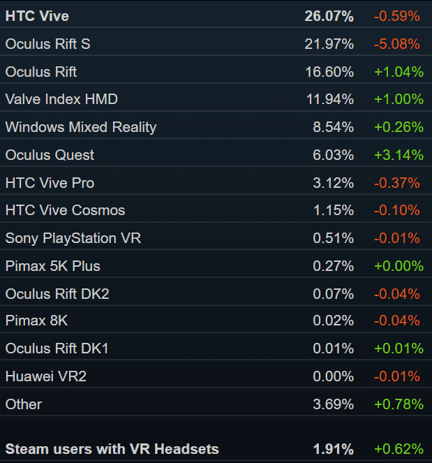 There is another possible explanation however. Inexplicitly, the Oculus Rift S dropped from 27% to 22%, formerly being the most popular headset but now losing out to HTC’s original Vive from 2016. It may be possible that Valve corrected an issue that was causing some Quests to be detected as Rift S.