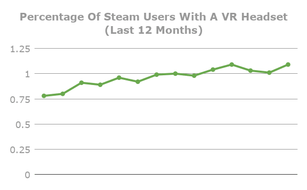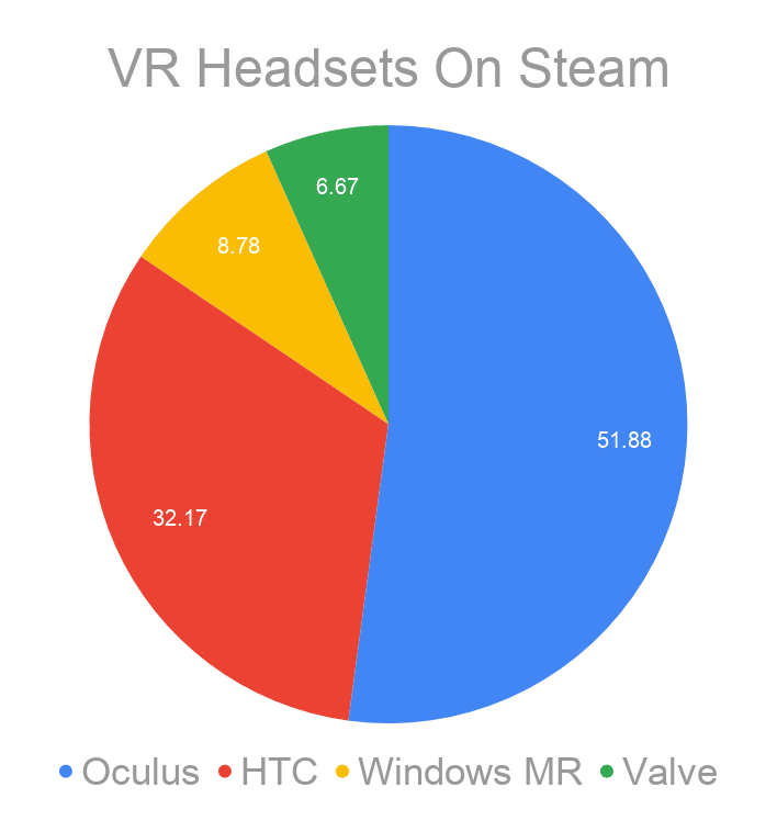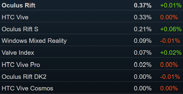 Valve’s high end Index headset saw +0.02%. This is impressive given the full kit is priced at $1000. But for that price, however, users get arguably the best overall VR experience available, including a 144Hz refresh rate which makes the world feel solid and object motion feel real.
