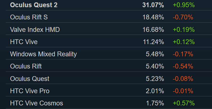 Facebook’s Oculus Quest 2 now accounts for 31.07% of the VR headsets used on Steam.