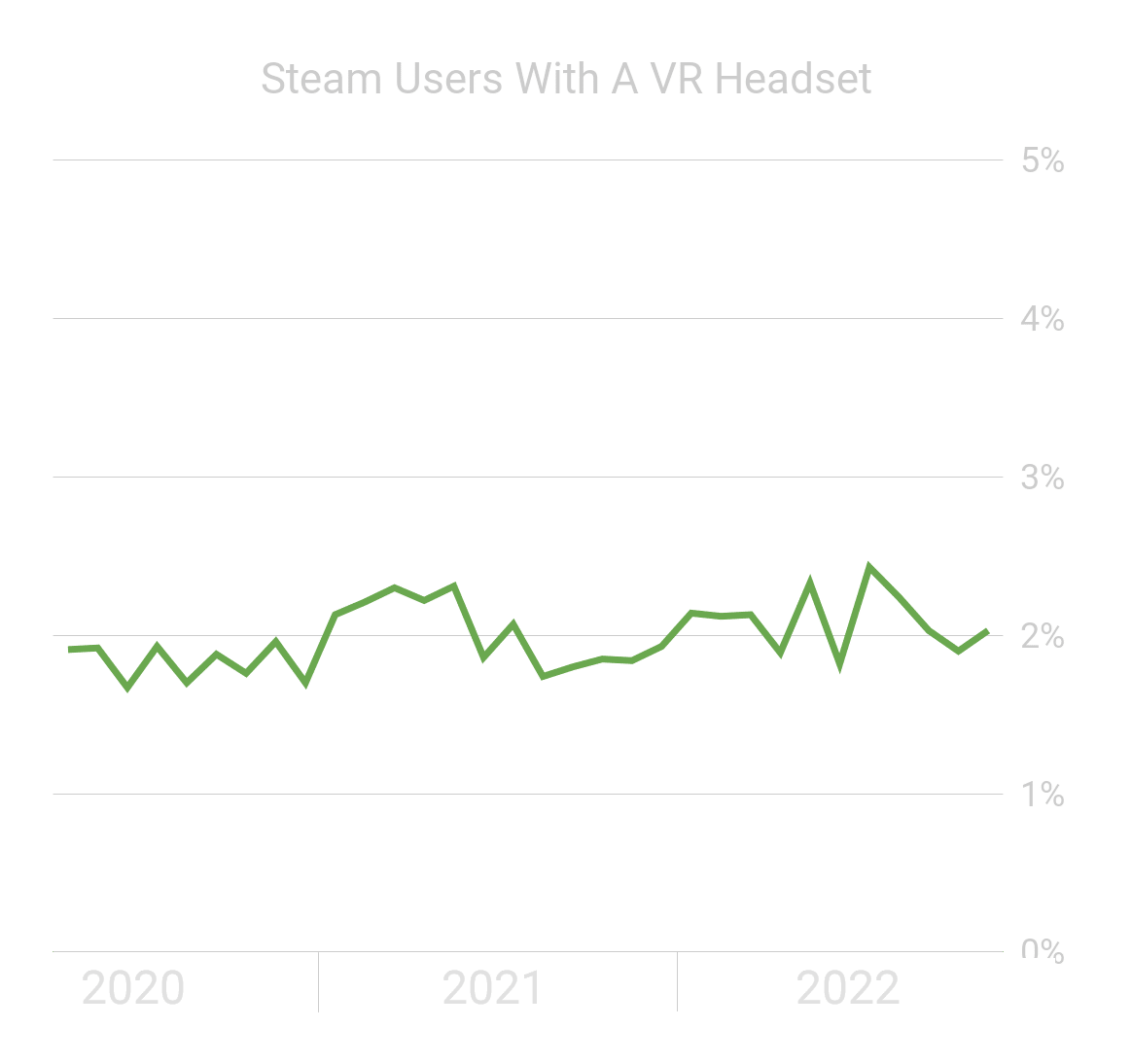 The overall Steam users with VR Headsets figure increased, from 1.9% in October to 2.03% in November. PC VR headset usage growth continues to stagnate relative to the wider PC gaming market.
