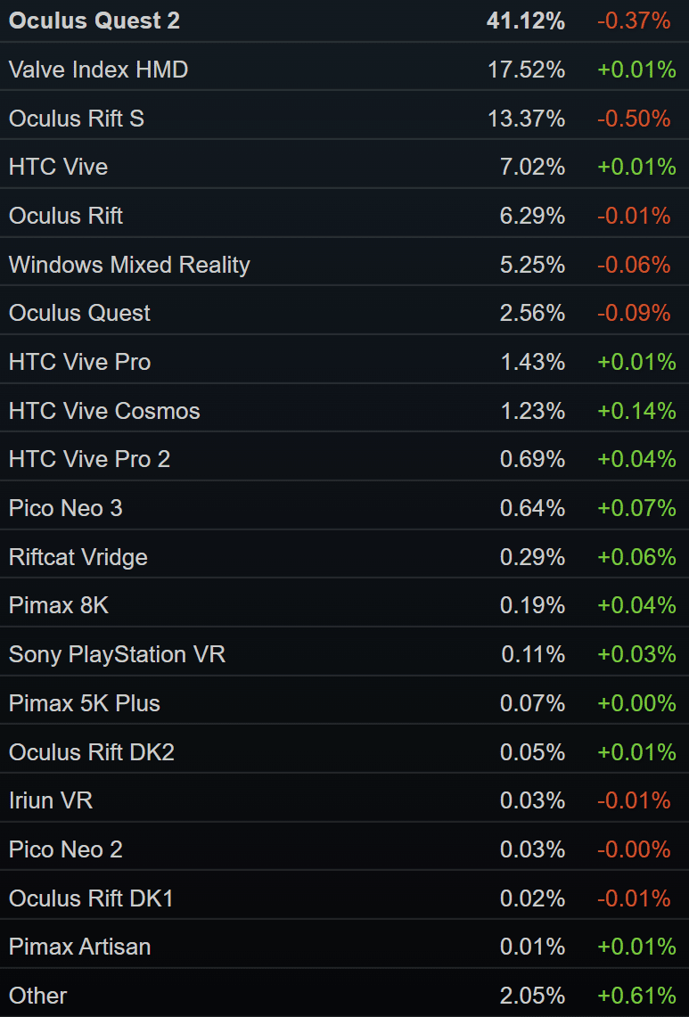 When it comes to the per-headset share of SteamVR usage, the fastest growing type in November was ‘Other’. This category likely includes Quest Pro using Quest Link and Pico 4 accessing SteamVR through Pico’s software, since they aren’t listed separately. Valve may break out each headset’s usage into a new row as the number of owners of each grows.