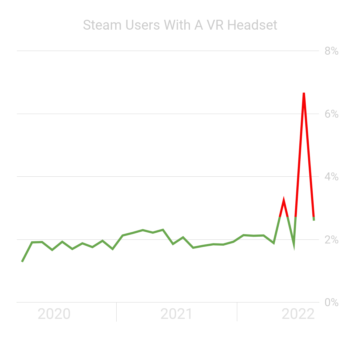 But the data for two months this year contained clearly anomalous figures for ‘Steam users with VR Headsets’. Since the introduction of the SteamVR log scanning method this figure stayed roughly stable around 2%. But May 2022’s data showed a large unexplained jump to 3.24%. June’s data returned to the normal range, but July’s shot back up to 6.67%.