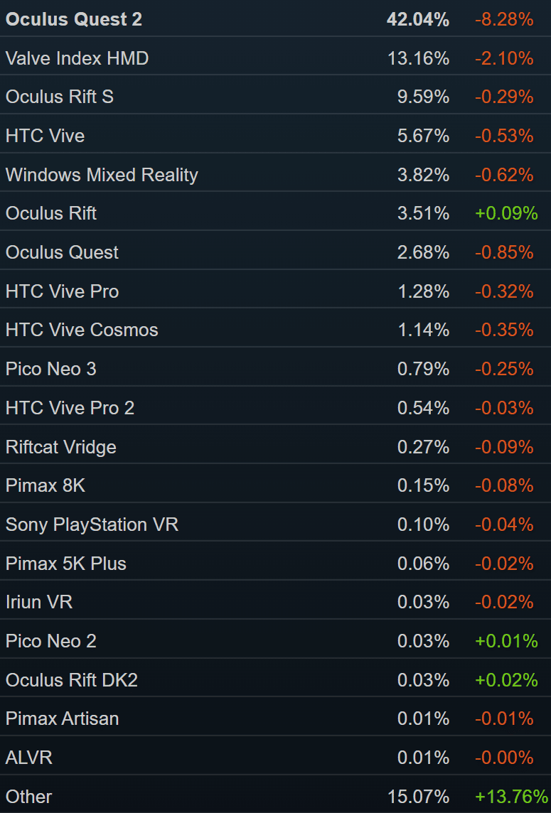 This increase seems to be made up from losses in almost every headset listed in the survey, including an 8% drop in Quest 2 users, the platform’s most popular headset. According to the survey data, the only headsets which experienced growth in September were the original Oculus Rift, Pico Neo 2 and the Oculus DK2 from 2014. Suffice to say, this almost certainly wasn’t the case – there’s likely something very wrong with this data.