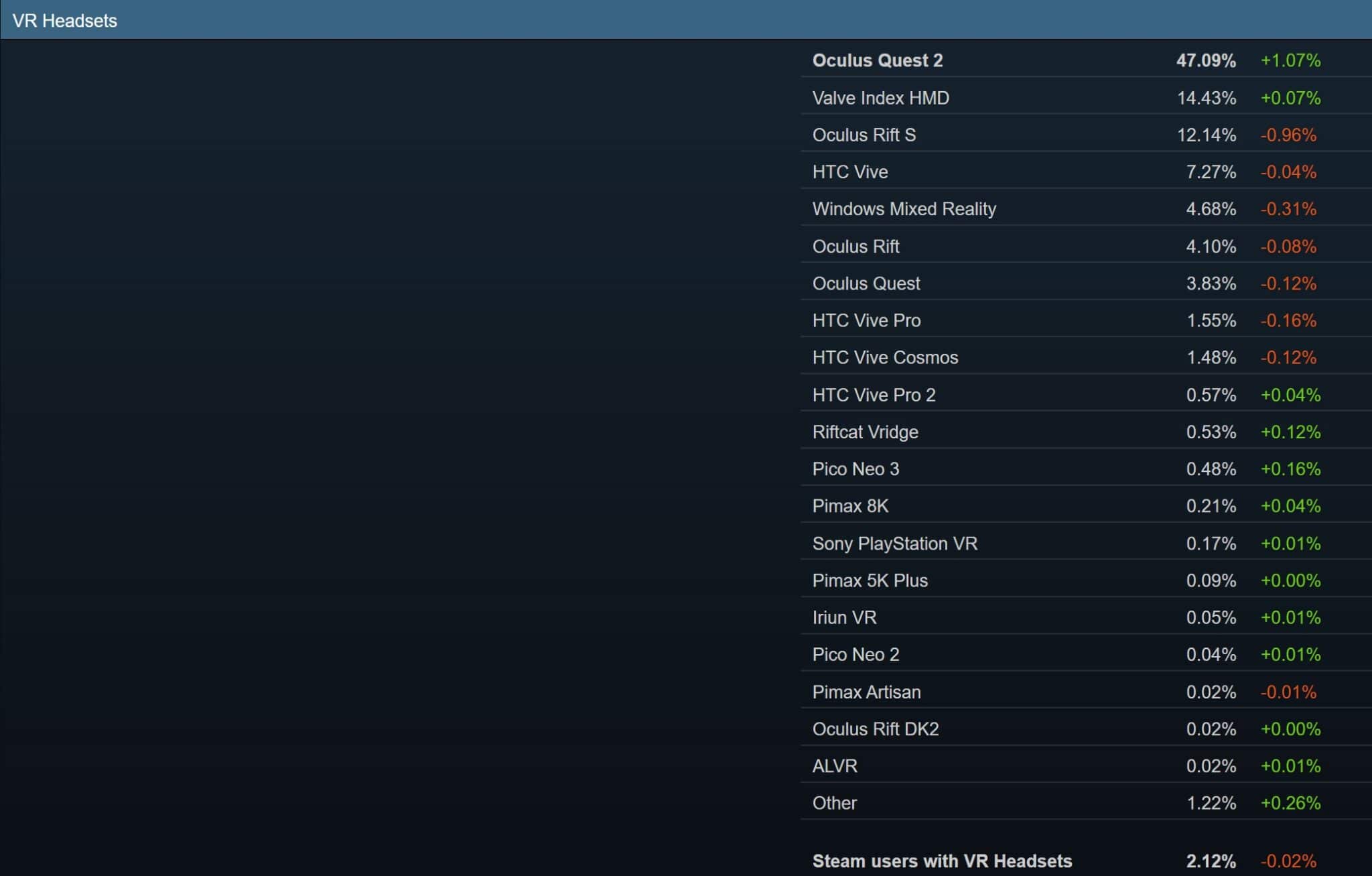 Some of that loss can be attributed to small gains for other headsets. Valve’s Index bumped up slightly to 14.43% and is still the second most-used headset on the platform. HTC’s Vive Pro 2 also saw small growth, though all other Vive headsets fell too. Overall the share of Steam users that used a VR headset fell slightly from 2.14% to 2.12%.