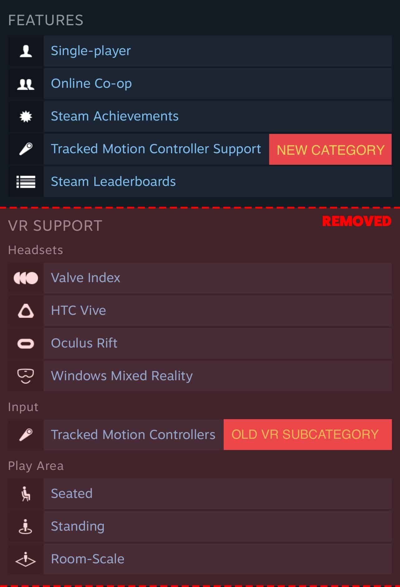 But that sidebar has now been removed, and the specifics of VR support are now buried in the System Requirements as a non-searchable text field. Strangely, the ‘Tracked Controller Supported’ tag was kept and moved to the list of general features on each store page. Games supporting specific headsets or play area sizes can no longer be searched for.