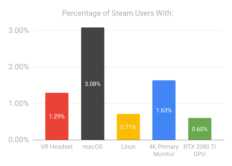 More Steam users have a VR headset than an RTX 2080 Ti or than use Linux. At current growth, it shouldn’t be long before more Steam users use a VR headset than have a 4K primary monitor.