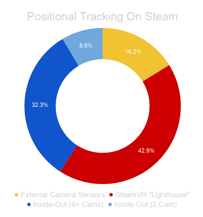Inside-out tracking has enabled lower cost headsets and easier setup, accounting for the majority of VR headset growth since May 2019 thanks to the Rift S. However, 6 in 10 headsets on Steam are still tracked with external hardware thanks to the huge numbers of Oculus Rift and HTC Vives still in use.