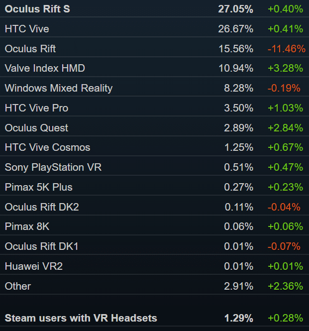 Valve’s Steam Hardware Survey now includes any VR headset used in the past month, revealing that 1.29% of users have a SteamVR compatible headset.