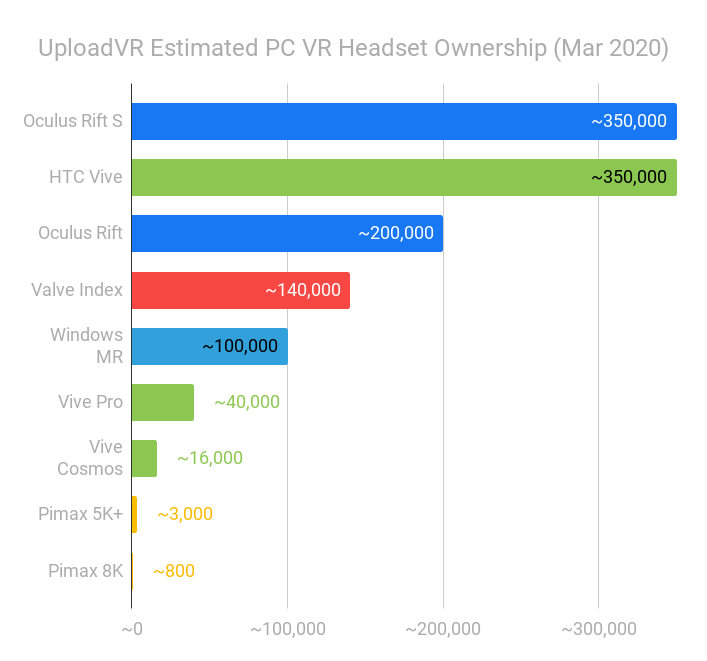 Using the March Hardware Survey data and the estimate of 100 million Steam active users, we can arrive at what should be a decent estimate for how many of each headset are in use.