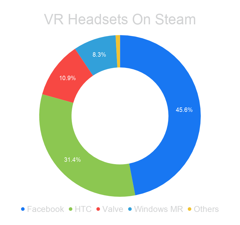 Just under half of the headsets on Steam are from Facebook’s Oculus Rift brand. The company’s newest PC headset Rift S is the most popular headset on Steam, used by more than a quarter of SteamVR users. The original Rift, once the most popular on Steam, is now used by 16% of SteamVR users.