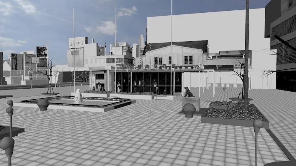 To travel to the past, we used an HTC Vive Pro headset, two Vive controllers, and a backpack similar to ones worn at The VOID, or Dreamscape. We only used the controller to point; the touchpads were off limits. Completely set up with our equipment, the narrated demo began. The narrator gave us some backstory on Shibuya, explaining that we were going on a journey to see what it looked like in 1964. Our tour began with the Hachiko bronze statue near Shibuya Station. The narrator instructed us to walk up and touch the statue after hearing its backstory. I don’t recall seeing a statue while we were getting geared up, so that was a pleasant surprise.