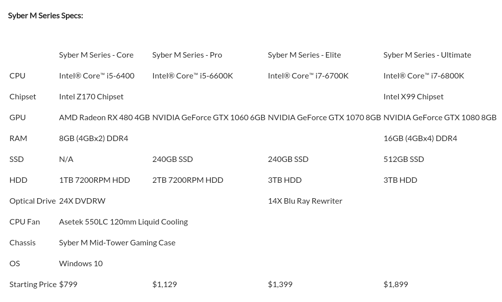 We could continue listing off the specs of each, but Syber Gaming has provided a helpful table to let you compare the different models quickly, which we’ve included below. Each model can be custom configured to support your needs, too. The rigs are available to pre-order now, and will be available at GameStop, Best Buy and Amazon as well as Syber Gaming owner, Cyberpower PC. Shipping is estimated to begin in two week’s time on August 26th.