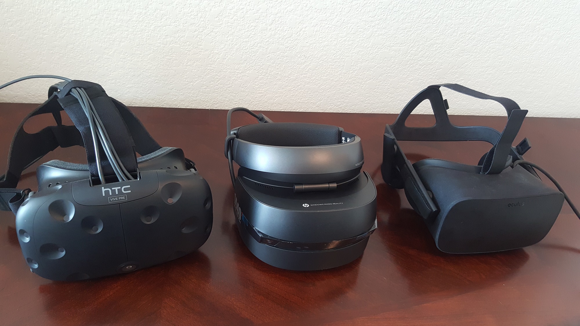 Here you can see a size comparison of the HTC Vive (left), HP Windows VR headset (middle), and the Oculus Rift (right).