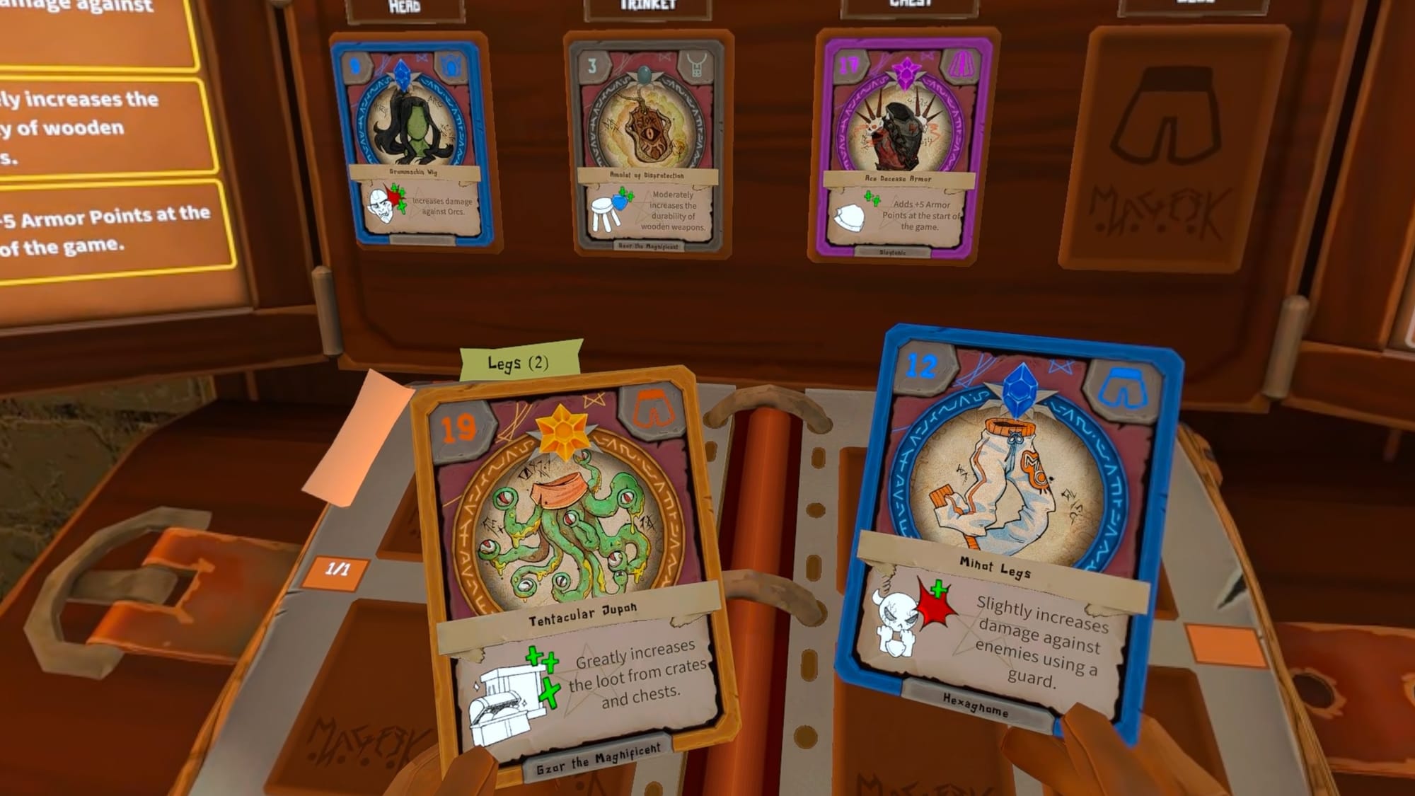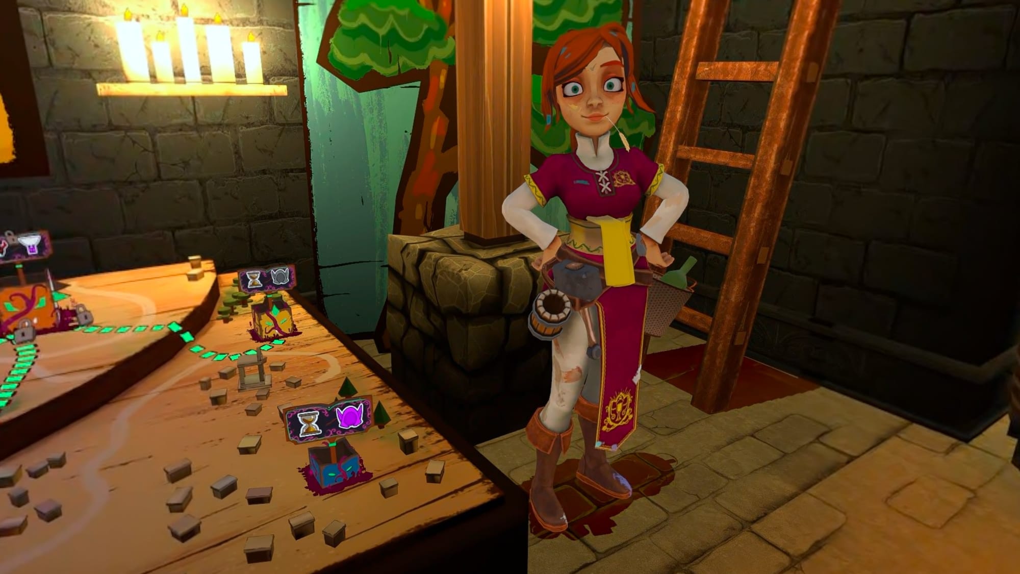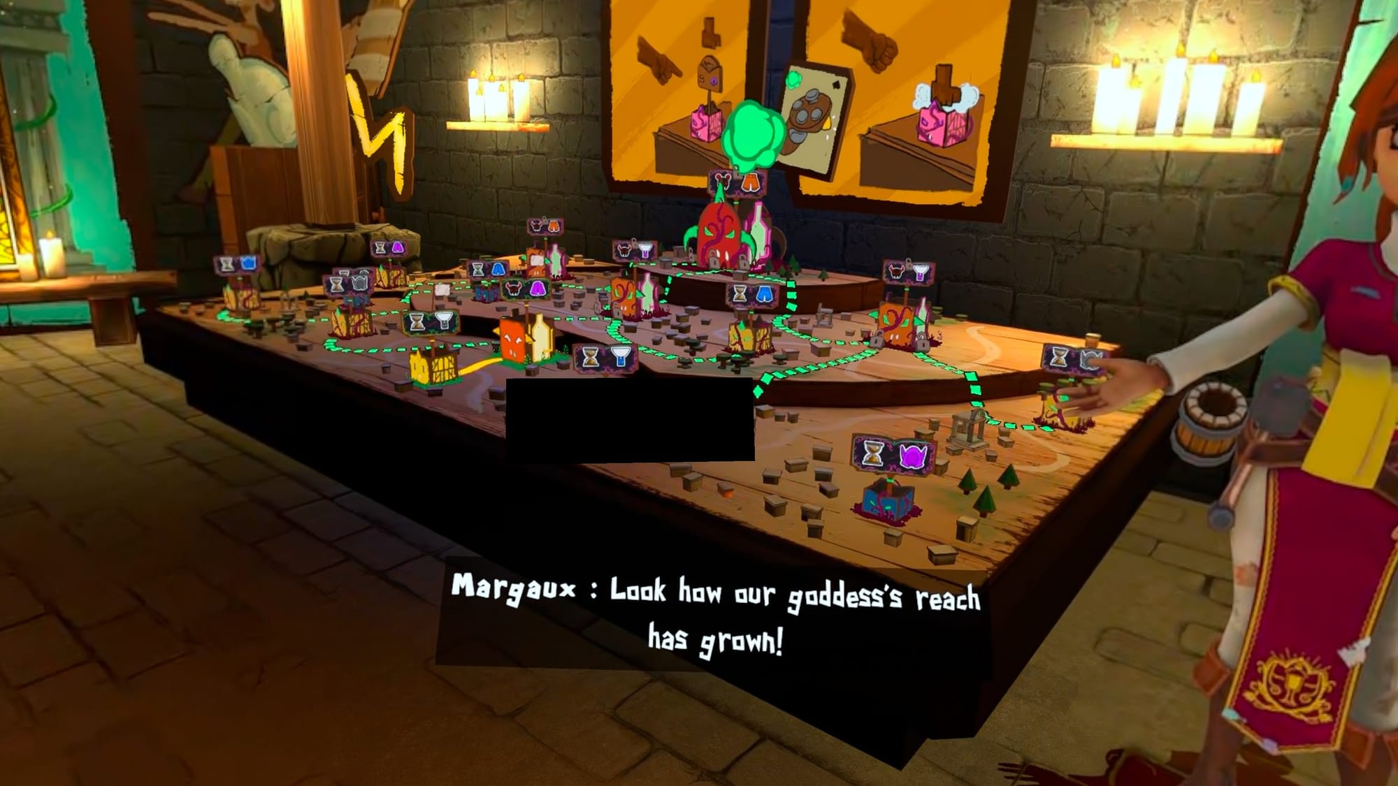 The gameplay loop of TaVRn's Takedown is fairly succinct. You begin the game in a small base which contains a friendly host named Margaux, a training dummy, an upgrade station for inspecting and equipping your card-based gear, and a diorama-like world map which shows fifteen-or-so orc-infested taverns (missions) that are available to visit. You select one of these taverns to liberate, and the beatdowns begin.