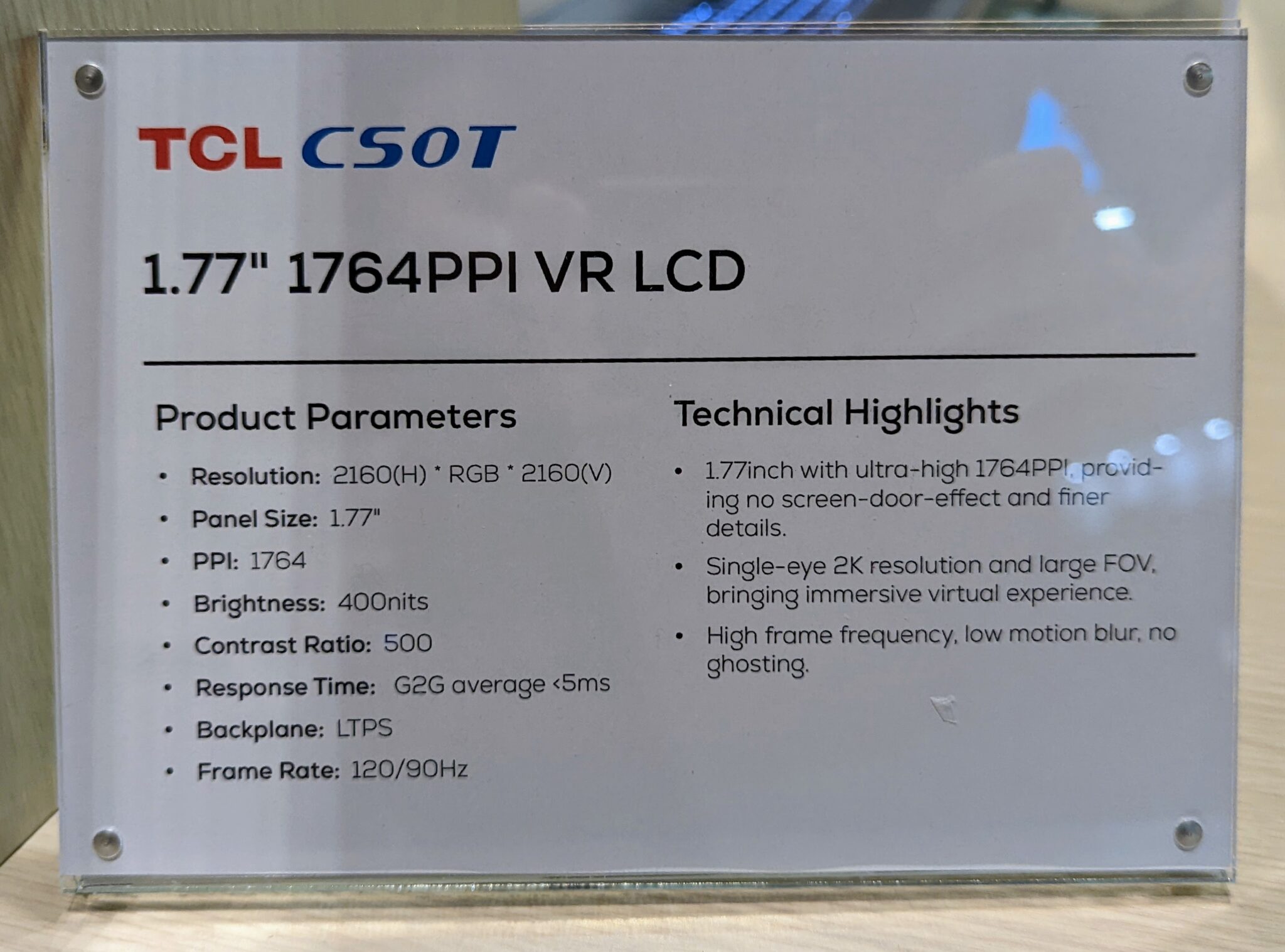 Neither new TCL panel is higher resolution or more dense than the stunning 3K panel JDI and Innolux also presented at Display Week. But both TCL panels are smaller, so could theoretically be used in extremely compact headsets.
