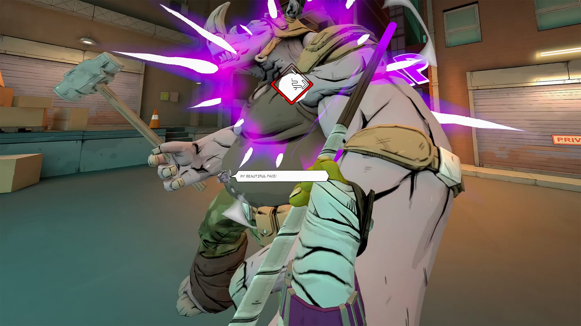 With the Foot ninjas out of the way, we dropped into an alley to fight Rocksteady. An invincibility debug mode was turned on for this fight so I could take it all in without worrying about dying. Rocksteady's attacks were varied, but not too difficult to understand. He swings a hammer, tries to gore you on his horn, and tosses explosives, all while constantly talking smack in a heavy New York accent. It's a fast paced, kinetic fight that felt ripped straight from the comics or any of the numerous Ninja Turtles cartoons over the years. After this, we returned to the lair where I discovered, for the first time, a crafting station built by Donatello where health syringes and other items can be acquired to take out on missions.