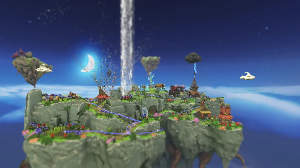 It’s a dark turn for what’s otherwise a bright and breezy game. Staring down into Tethered‘s floating worlds from above is a sheer delight in VR. Leaning in to inspect tiny details like the stalks of wheat that grow in farms or surround yourself in butterflies as they hover below is absolutely lovely. You move around the island by teleporting between a handful of set positions, represented as clouds.