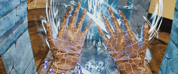 For example, to ready a fireball in my right hand I just hold my left hand steady, make a fist out in front of me with my right hand by holding the trigger, then sliding my right hand to the side quickly. Boom, fireball. Just throw and release like any other object to send it flying across the level. Slide my left hand to the right and a shield pops up on my wrist for blocking attacks. Move each hand towards my chest and an ice bow appears with a quiver of chilling white arrows on my back.