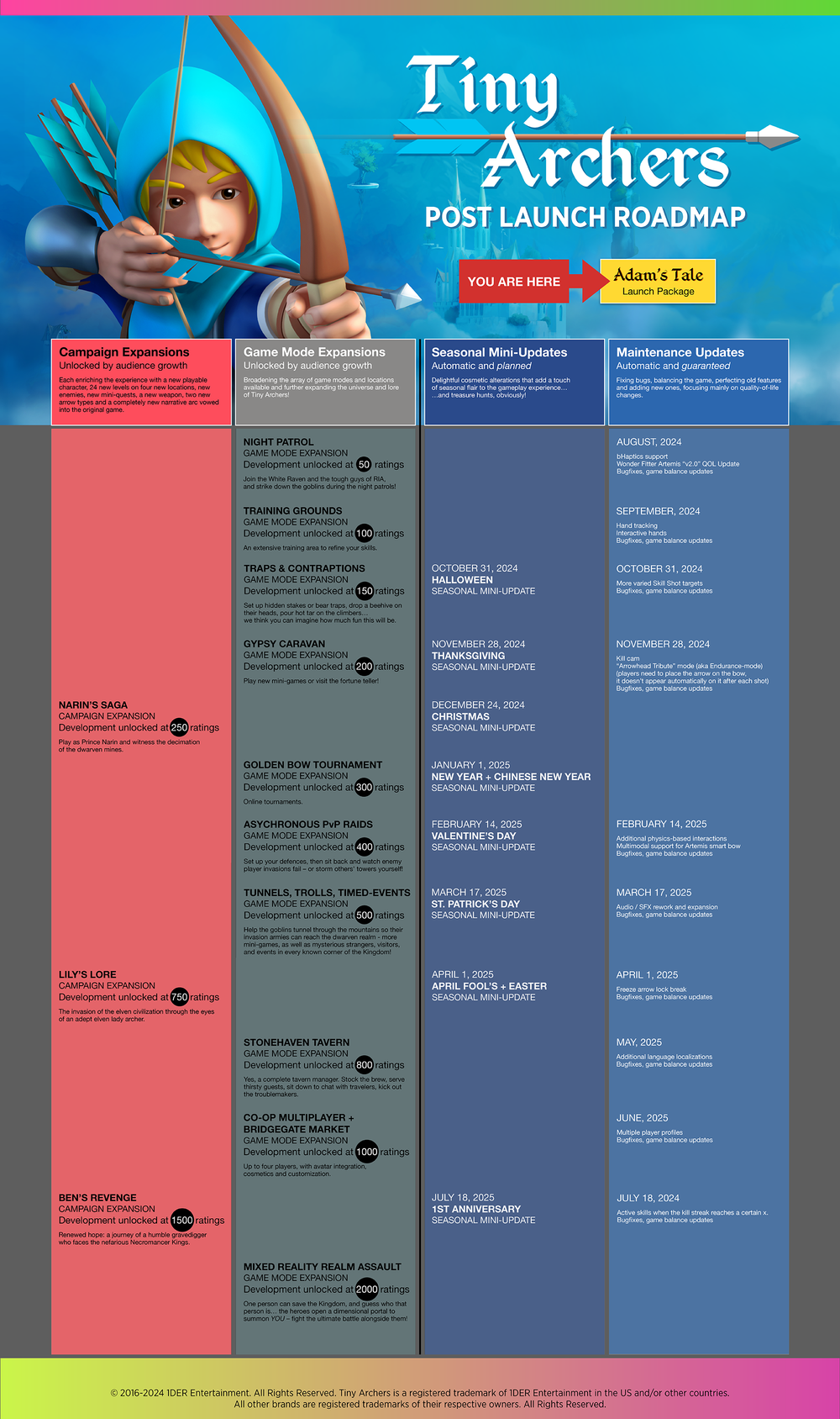 Developed by 1DER Entertainment, Tiny Archers VR adapts the mobile game for most major VR platforms. As a lone ranger atop a tower, you must defend the Northern Kingdom against a 24-day onslaught, protecting various colorful locations and stopping goblins from taking you out. Following an early access launch, it recently entered full release.