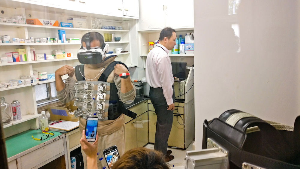 With The Hara Ue Project, a person physically lays down on the ground and the tech simulates a female with a short skirt walking on the wearer’s chest. A vest provides haptic feedback while the VR headset provides visuals.
