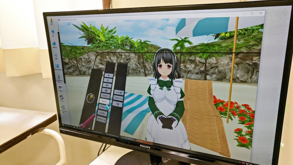Custom Maid 3D software was also on display. It begins by modifying a character with choices similar to the character customization of roleplaying games. After building a fantasy maid, the character is then fully interactive.