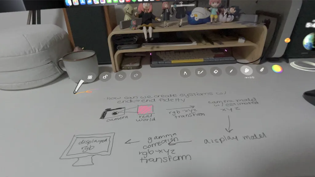 The app is also a powerful demonstration of hand occlusion for the virtual content you create on the desk's surface. The effect of covering a sketch with your hand can be feel like peek-a-boo, surprising yourself to reveal the content underneath when you move your hand away again. You can sketch something out on your desk in mixed reality by directly touching the surface like fingerpaint, or do a kind of gesture-directed drawing that works in full VR too.