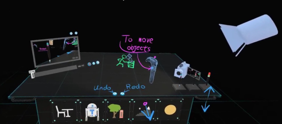 It’s also possible to teleport like in The Lab and sketch like in Tilt Brush. It’s even possible to teleport into a drawer to see what a prop looks like full size before you bring it out onto the table. Every movement can be recorded and played back. The way to do this is simple: move a virtual camera with one hand and an object with the other while recording is on to make an animated movie. The developers want to release it as an early access beta on Steam in late August, with collaborative features to be added eventually. So you should be able to occupy a single virtual space with other people once that is added.