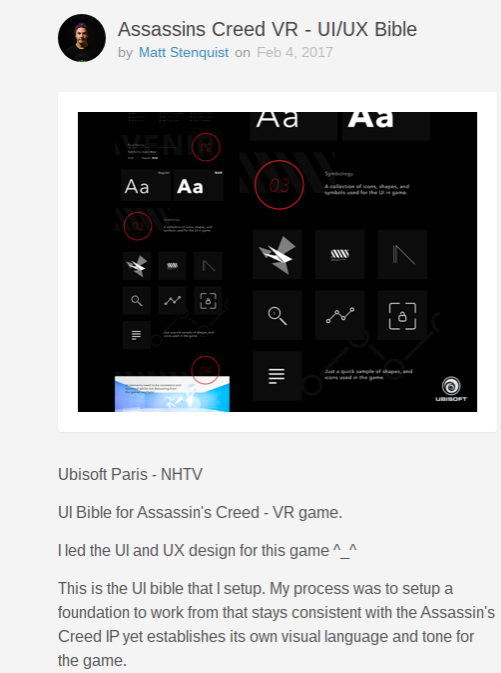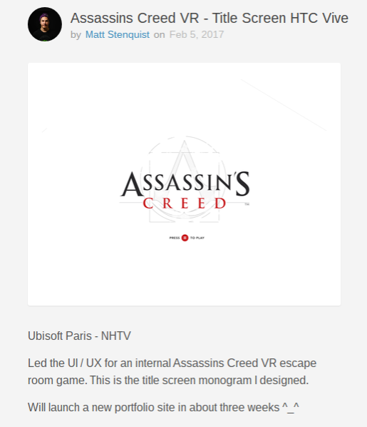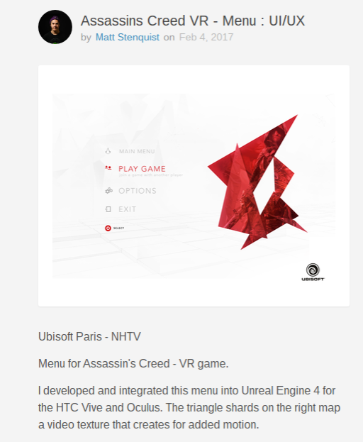 Judging by a recent post on design website Dribbble, the company could at least be working on something tied to the series internally. UI and UX designer Matt Stenquist recently posted images of logos and icons for what he described as “an internal Assassins Creed escape room game.” Stenquist says he “Led the UI/UX” for the project, apparently for Ubisoft Paris. Going by the descriptions for the images, the project was developed for the HTC Vive and Oculus Rift using Unreal Engine 4. It’s also a multiplayer experience.