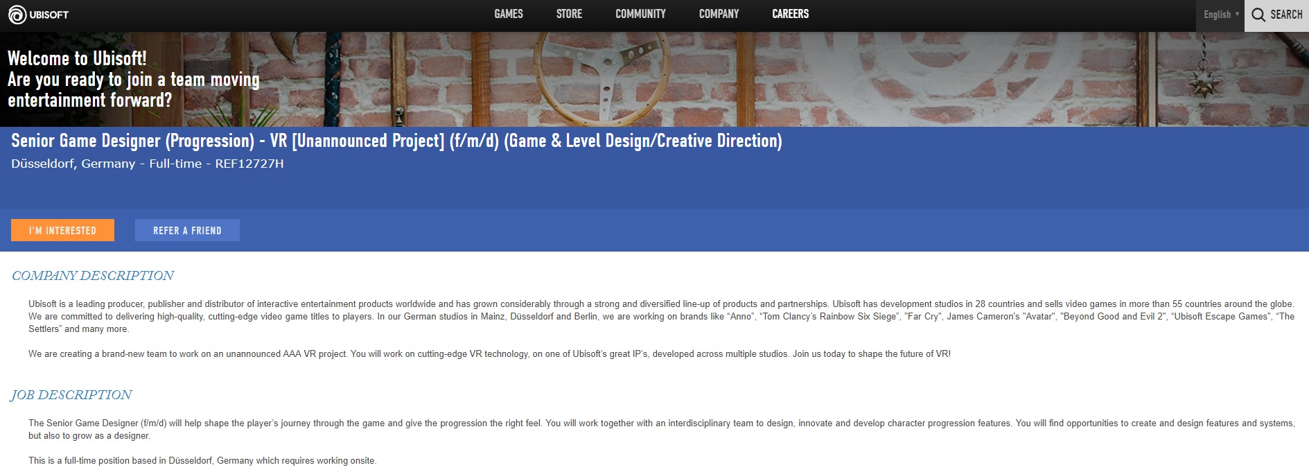 The company currently has nine high-level listings related to the project in Dusseldorf, Germany (first spotted by VRFocus). One for a Senior Game Designer role states that successful applicants “will work on cutting-edge VR technology, on one of Ubisoft’s great IP’s, developed across multiple studios.”
