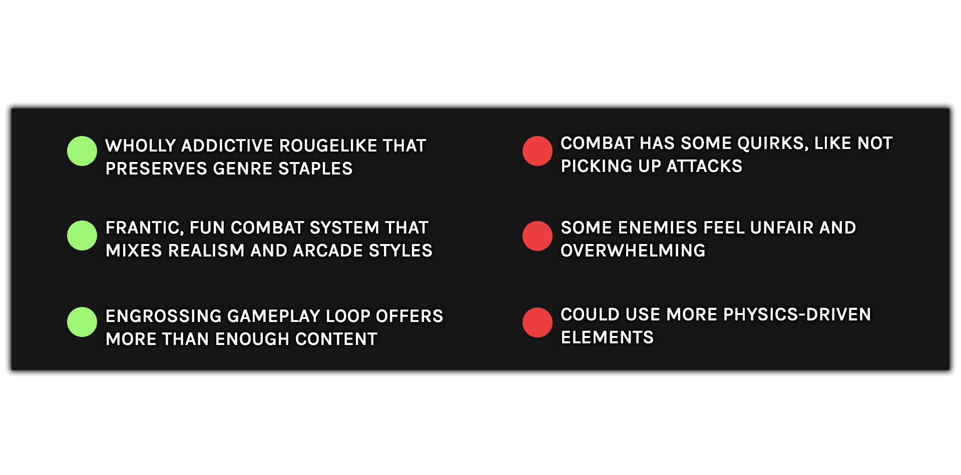 Sometimes the odds are stacked too far against you for anything to really matter, though, like when multiple enemies fight you at once. Their presence on screen makes it almost impossible to see some attack indicators in time, leading to some cheap hits that frustrate a promising run. One mid-game enemy fires projectiles that need to be parried, but finding the right technique is incredibly difficult and can bring you right back to the start in seconds.