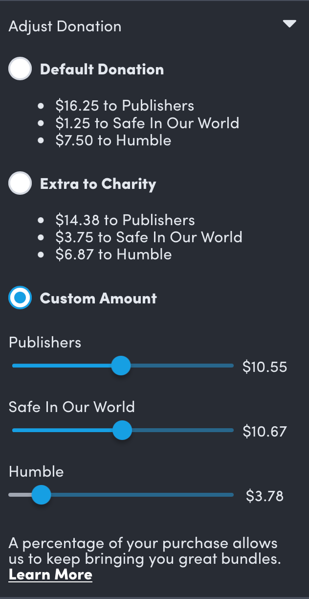 The bundle is listed as having a non-discounted value of $199, meaning that the work of the artists represented in this bundle is originally valued at just over $20 for each game, on average. The discount means that if you are a VR gamer somewhere in the world and can afford to pay above the minimum on this bundle, you have an unusual amount of power here to surprise a charity or a VR publisher with a large chunk of change meant just for them. Please consider sending a few dollars you've saved with this incredible discount to someone who could really use it. Here's an example of how you can adjust the default $25 Humble Bundle pricing to give extra to charity and to the publishers of these games: