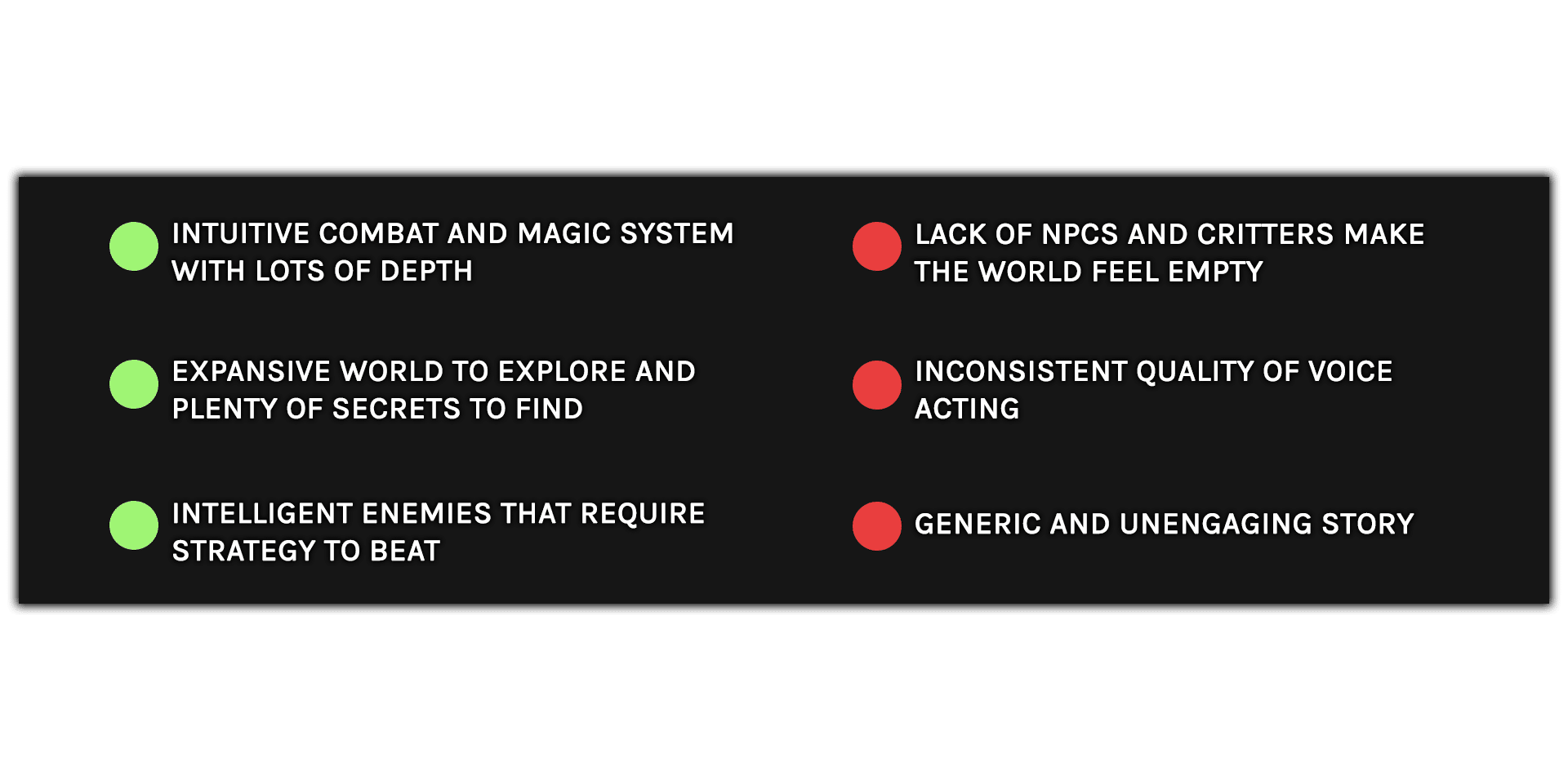 Apart from the monsters and other enemies, there is little that gives the world a sense of life. Villages and other settlements feel bare, with only shopkeepers there to greet you. A few more NPCs dotted around—or some birds, or sheep and chickens—would make it feel a lot more like a real place.