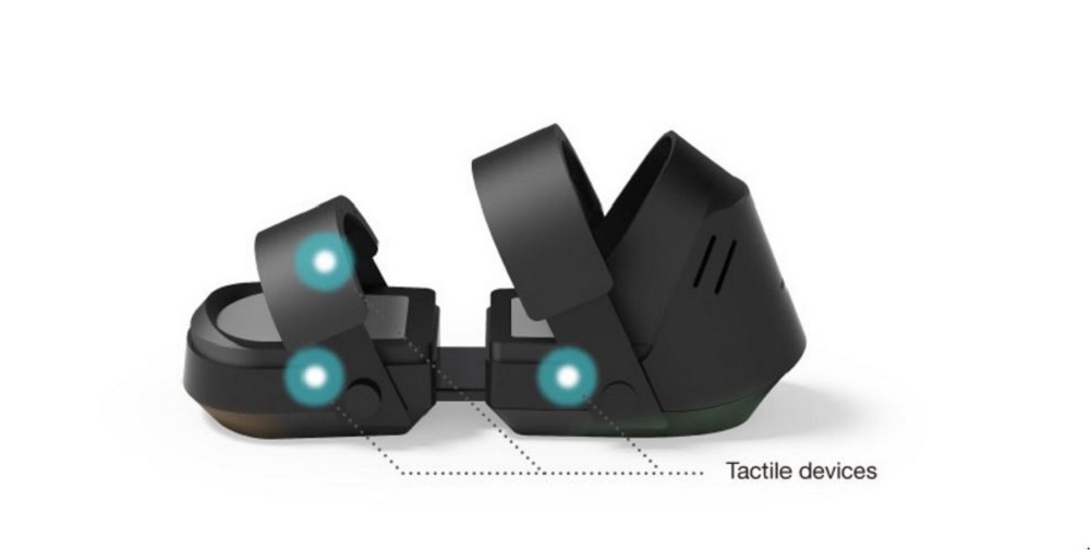 Cerevo designed the shoes to not only be tracked in 3D space as you move around, but also to provide tactile feedback. The idea here is that whether you’re walking on a hardwood floor or on the sand of a beach, the sensors around your feet will know and transmit the appropriate physical sensation. Each shoe has three sensors, depicted above, in addition to one sensor in each of the hand controllers.