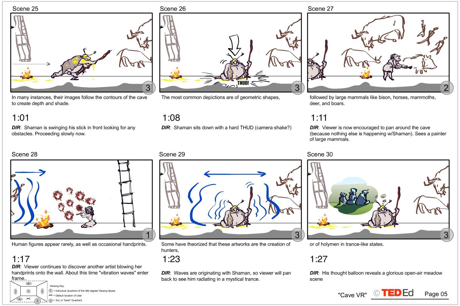 I was feeling deadline pressure to create the storyboards as soon as possible because by this time the script was finalized and approved. The problem was that I still hadn’t decided on a visual style for the education aspect of the short. TED Ed’s lessons are just that–real educational presentations told by utilizing all of the tricks in the animation toolbox. In a normally framed 2D production I would identify the major teaching moments in a given script and design those main pieces first. Then I would work on their periphery, designing transition sequences in and out of the main teaching highlights. The difference in designing for VR is that as a director, I cannot force the viewer to absolutely look where I want them to look, when I want them to look there. There are certainly some screen direction tricks I could (and did) employ, like having nothing visual moving anywhere but one spot in the 360 space. Or having the subtle ambient soundtrack suddenly present a stinging audio hit to alert the viewer to look around for the cause of the sound. But that tool set is limited and gets tiresome after a surprisingly short amount of time. I came to realize that I needed to let the voice-over track run without assigning visual “hits” to it, as I would normally do. Rather, I would let the VO run on its own and I would design set pieces that encompassed all of the details spoken about in the narration. By not having to isolate each teaching moment in turn, I was never forcing the viewer to continually search the environment for where to look next. This was a huge breakthrough because it freed me into thinking about larger set pieces that could contain major chunks of the story. I ended up dividing the piece into four discreet environments, each with its own character, ambiance and “feel”.