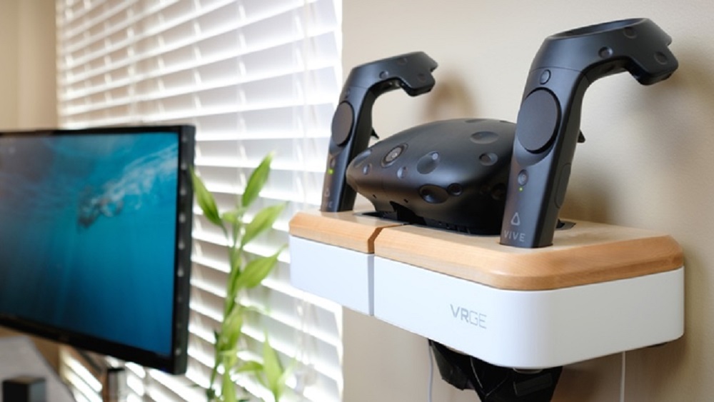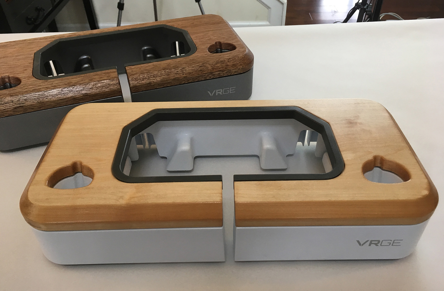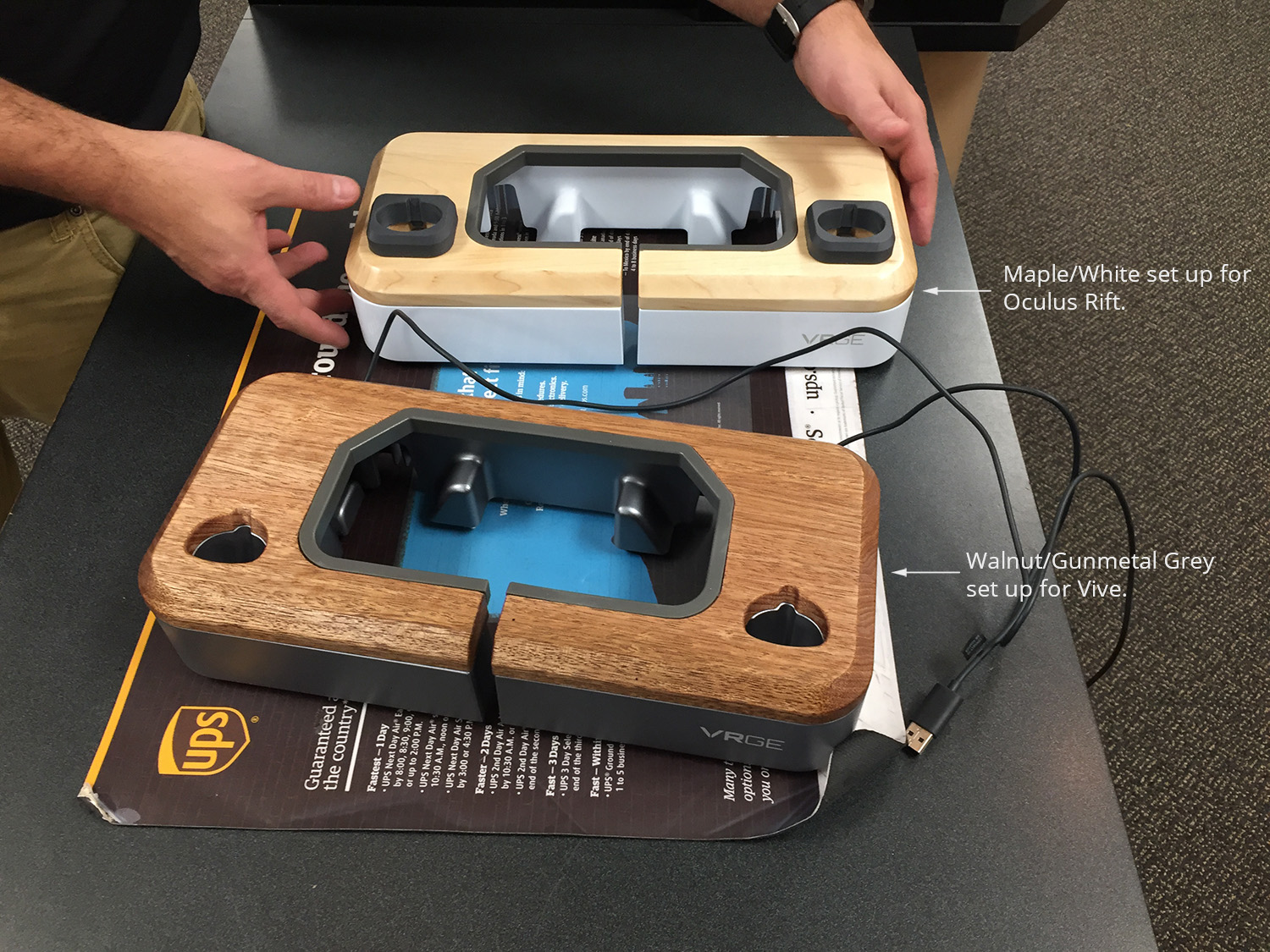 You can order variations that are designed for either the Rift, Vive, or PSVR, and each edition has a spot to place the headset and its accompanying gamepads or motion controllers. The cord slides through the slit in the front, the headset rests in the middle, and the controllers stand on the sides. USB dongles are fed into the units for easy charging all in one spot.