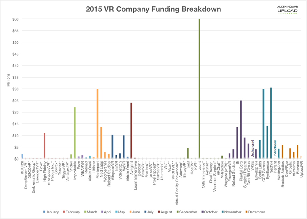 This chart displays the amount of money invested into 74 VR companies in 2015. Thus, the total amount of funding for some companies is not represented. If some companies appear twice, it’s because they raised multiple rounds in various months.