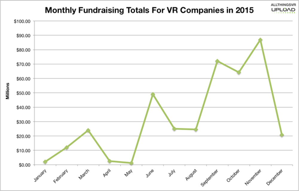 The first half of the year saw minimal investments. Rothenberg Ventures took the first plunge investing ~100K into multiple VR startups taking the first plunge and voicing their belief in the future of the industry. It wasn’t until June that we saw a huge spike in investment and served as a catalyst for high investment dollars the rest of the year. There was a natural drop in December because of holidays, but expect January 2016 to pick back up again.