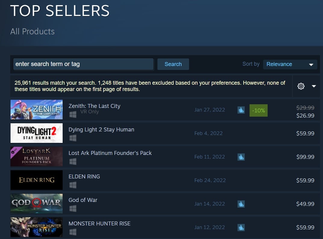The US charts for the PC store place Ramen VR’s new game at the very top of the list. To be clear, this isn’t a VR-specific category, it’s for every game on Steam. Currently Zenith is beating out pre-orders for Dying Light 2 and Elden Ring as well as recent releases like God of War and Monster Hunter Rise.