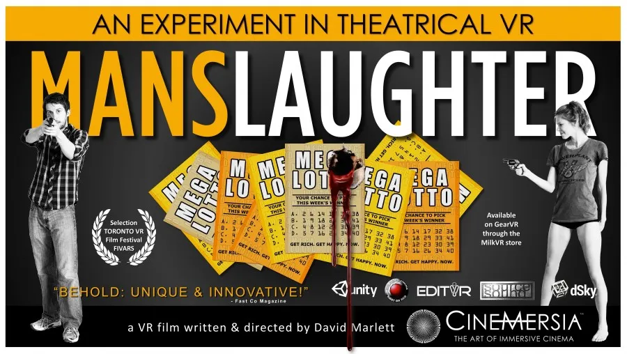 Experimental VR film MansLaughter from CineMersia and director David Marlett is now available for download in the MilkVR app on the Samsung Gear VR. The film is around 1 GB. Make sure you have the latest 1.36 version of the MilkVR app installed and choose the “best quality” option so it works with the key four quadrant storytelling being pioneered with the project.