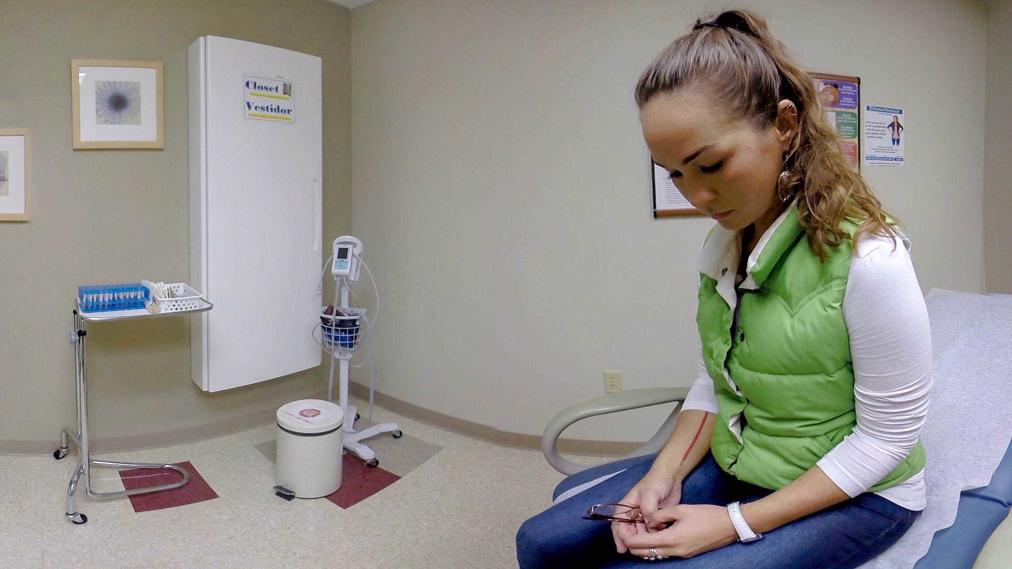 Across the Line starts off with a 360 video of an examination room where you see a patient of the clinic being comforted by a clinician. The young woman sits quietly in the corner, but is visibly upset. After some coaxing from the doctor she tells her it’s because of what the protesters had been shouting at her as she made her way into the clinic. At that point, the doctor asks for permission to give her a hug, and you get a real sense of how helpless and vulnerable that person is feeling. As with most 360-degree video, your eyes tend to wander around the room sometimes, but mine is constantly drawn back to the lonely figure of this girl sitting on the examination table. Then as the she fidgets nervously my gaze is drawn to the two long red scars on the inside of her wrists. The unspoken story they tell is poignant. This being VR, I feel like I can almost reach out and touch those scars before the scene fades to black.