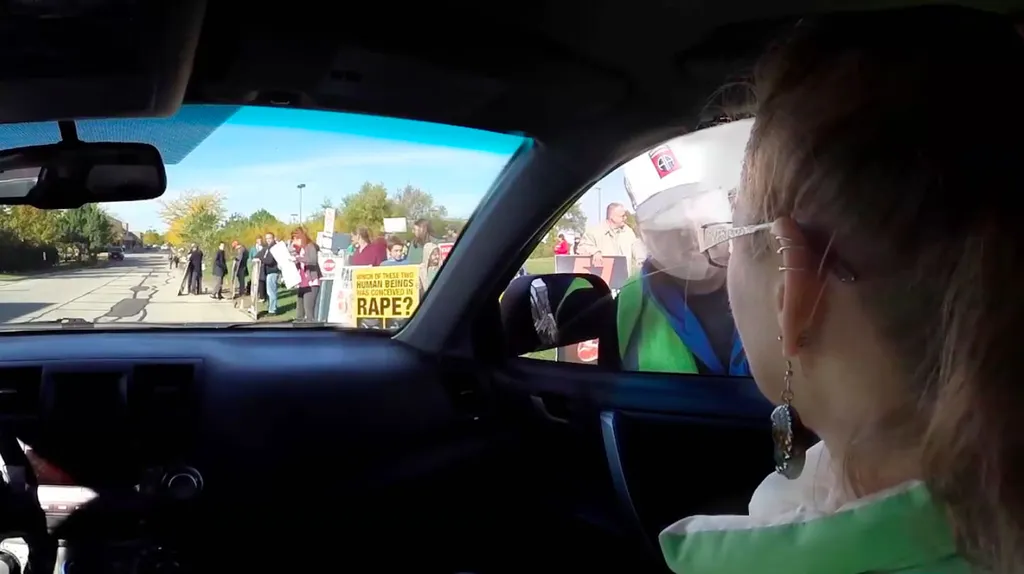 The experience then takes me back in time a few minutes, to the clinic entrance at the time when that patient is arriving for her appointment. You’re inside the car with her and the friend who’s driving her in, and they’re both nervously trying to find out where to go. There are protesters with placards lining the side of the road, and a man in an official-looking high visibility jacket approaches the car window. They ask him for directions, only to have him forcefully plead with the girl not to go in. They finally drive away with the angry shouts of the crowd echoing all around them.