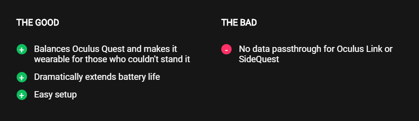 The only downside we could find with the VR Power is that it isn’t compatible with Oculus Link. When I asked Rebuff Reality about this, they let me know that, “VR Power is optimized based on Oculus Link charging specifications, however, it is not able to pass through data from your computer to the Oculus Quest.” This means that you can’t use the VR Power as a battery device while you’re using Oculus Link, but you can still keep it attached to use as a counterweight for comfort.