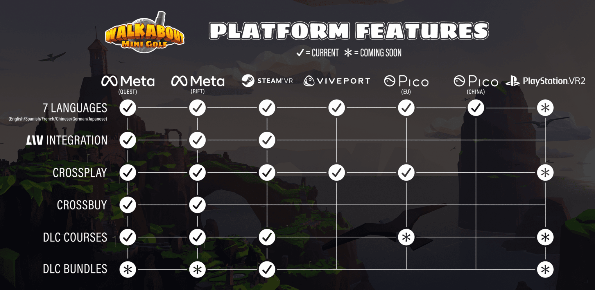 For those unfamiliar, Walkabout Mini Golf is available on all other major VR headsets with room code cross-platform multiplayer and a growing collection of impressive paid add-on courses, including Atlantis, 20,000 Leagues Under The Sea, Myst, and Labyrinth. Notably, however, the chart shared by Mighty Coconut below marks a critical difference in the availability of the paid DLC courses across platforms, with Pico outside China and PSVR 2 both listing the add-ons as coming soon. While Viveport and Pico in China also offer Walkabout, there’s no timeline on either platform for the DLC courses and China-based players can’t play with those outside the country.