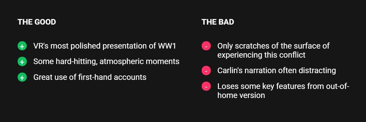 Think of War Remains as a companion piece to bombastic Hollywood takes on the First World War more than a truly authentic time machine. Its explosions shake you to the core and its gunshots rattle through your head without care for composure, while Dan Carlin’s gravely-voiced narration steers you through the horror. And yet, within this searing, explosive snapshot of terror is the distinct feeling you’re not getting the complete picture.